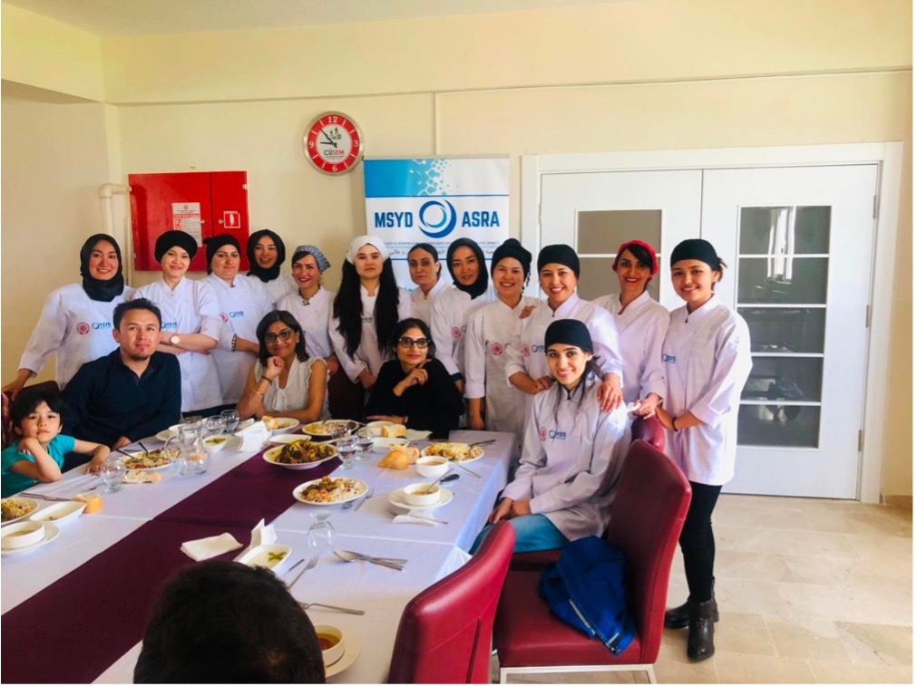Participants of the short-order cooks program prepare a meal for trainers Khairunissa Bhanjee and Khairunissa Panjwani on World Refugee Day (June 20th).